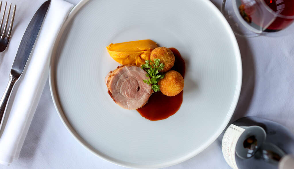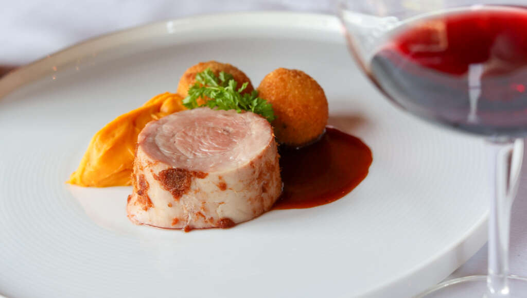 Pork roulade is slow roasted until perfectly cooked. To make the sweet potatoes, cut into thin slices while raw, caramelize in the skillet with water that will cook off, then add cream and cook down further. The croquettes are made with potatoes, egg, ham and cheese, shaped into balls, breaded and fried to crispness. The red wine jus is a reduction made with Pinot Noir and beef stock demi-glace. Add herbs like thyme, rosemary or other hard herbs to make an herbaceous sauce. Garnish with chervil and serve with a King Estate Pinot Noir like Stone’s Throw.