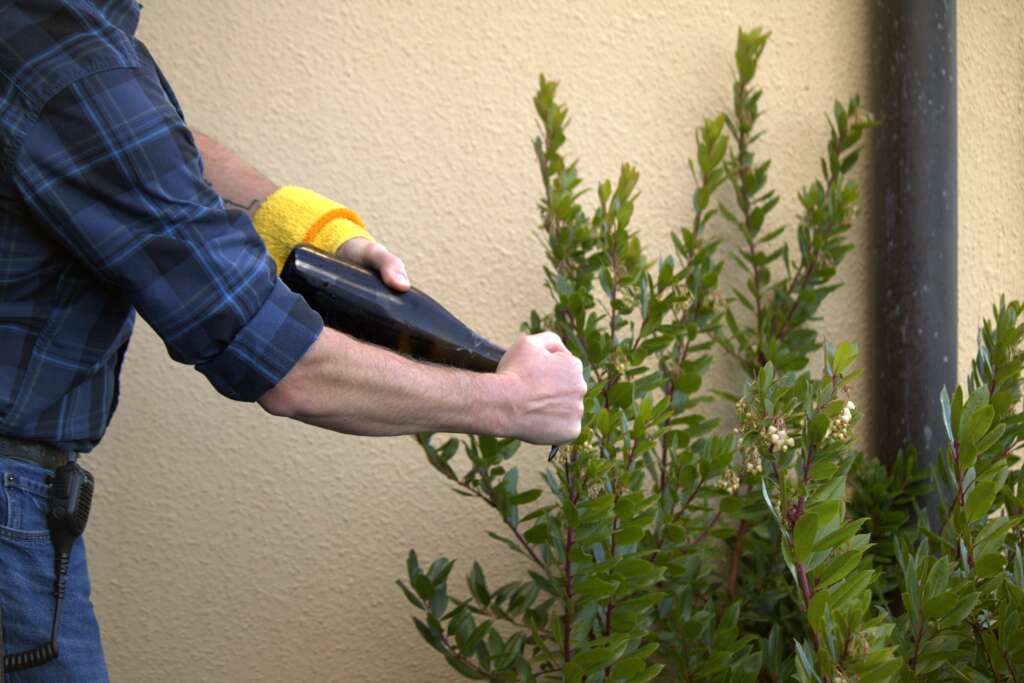 To expel the yeast plug, the bottle is held in an inverted position. In one smooth motion, the bottle is rotated upright and while the crown cap is removed. The pressure inside the bottle will expel the yeast plug. If the wine is cold enough, the bubbles will stay in solution and minimal wine will “gush” out of the bottle.
